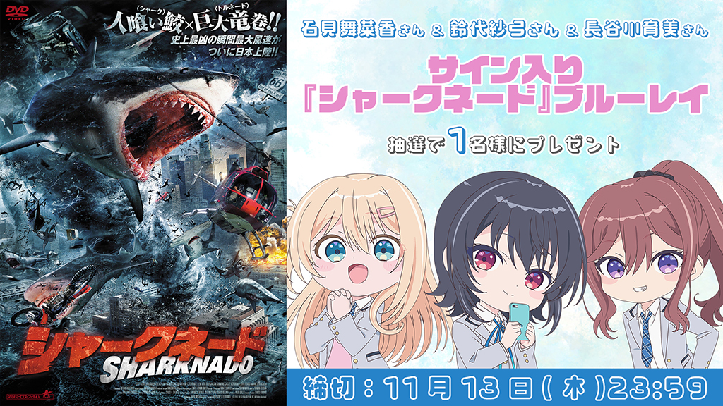 締切までに公式Xアカウントをフォロー&キャンペーンポストをリポストしていただいた方の中から抽選で1名様に、朝凪 海役の石見舞菜香さん、天海 夕役の鈴代紗弓さん、新田新奈役の長谷川育美さん、3名のサイン入り『シャークネード』ブルーレイをプレゼントいたします。
