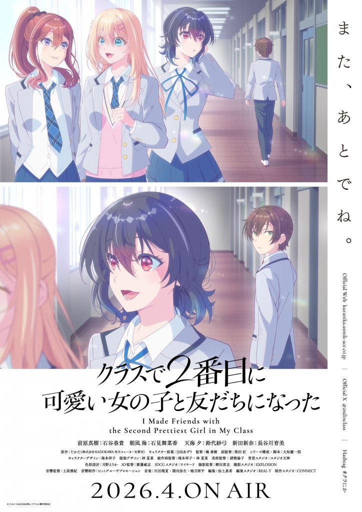 ・本キャンペーンのために投稿された内容は、TVアニメ『クラスで2番目に可愛い女の子と友だちになった』プロモーションのために使用する場合がございます。公式サイト、公式X(旧Twitter)、公式Instagramおよび告知媒体(雑誌・新聞・TV・WEBサイト)にも掲載される可能性があります。使用に関するお問い合わせにはお答えいたしかねます。あらかじめご了承ください。また、使用方法やデザインに関しては、当社および当社委託先に一任するものとさせていただきます。